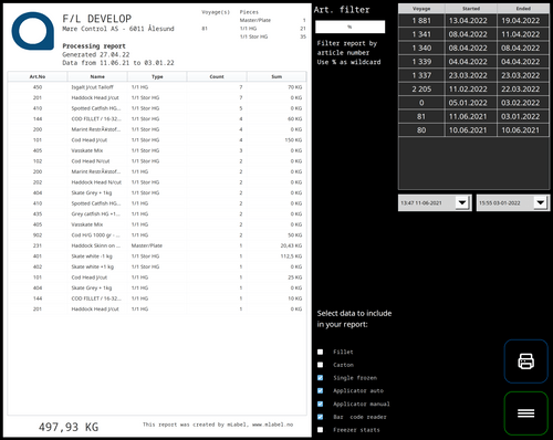 mLabel logger hva som er fylt i fryserene, skrevet ut på manuelle stasjoner og produkt som har gått forbi applikatoren. For nøyaktig rapportering er det støtte for å lese strekkoder på produktet før det går til fryselageret.